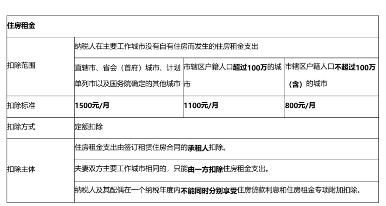 答:一、《国务院关于印发个人所得税专项附加扣除暂行办法的通知》(国发〔2018〕41号):“第十七条 纳税人在主要工作城市没有自有住房而发生的住房租金支出,可以按照以下标准定额扣除: