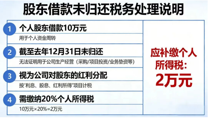 举个大家熟悉的例子:某公司个人股东去年从公司借款10万元,用于个人资金周转,截至去年12月31日仍未归还,且无法提供证据证明该笔借款用于公司生产经营(如采购、项目投资、业务垫资等),那么这笔10万元的未归还借款,将被视为公司对该股东的红利分配,需按“利息、股息、红利所得”项目,缴纳20%的个人所得税,即需补缴2万元个人所得税。
