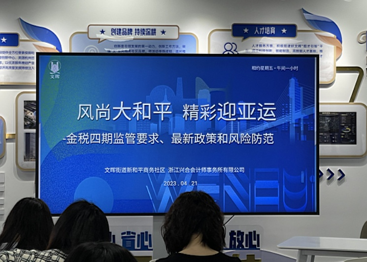 4月21日,新和平商务社区慧享大和平讲师团的成员,浙江兴合会计师事务所所长、党支部书记何建军走进新和平商务社区,开展“风尚大和平 精彩迎亚运” 财税专题公益讲座,拱墅区统计局、文晖街道领导和来自房地产、进出口贸易、科技、信息技术、文化等行业的财务人员共40余人参加此次活动。